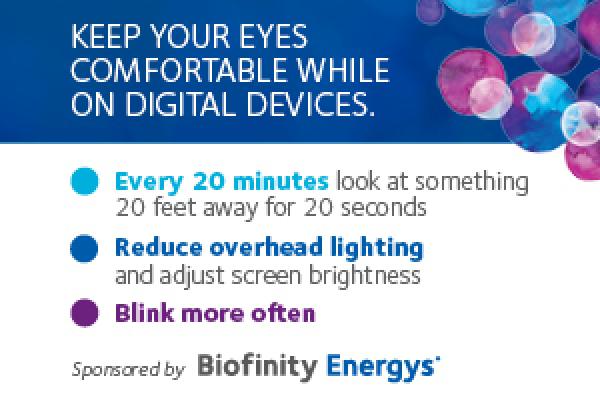 - Consider asking your eye care professional for a free trial of Biofinity Energys®, a lens built with your digital lifestyle in mind. Biofinity Energys® contact lenses help with eye tiredness caused by focusing on close-up digital devices. In fact, 75% of wearers agree that Biofinity Energys® lenses help their eyes feel less tired at the end of the day, even after a long day of using digital devices1.