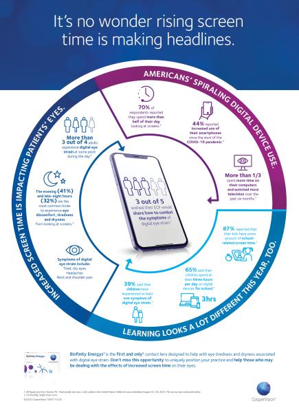 “Through the years, advances in technology have led to ever-increasing rates of digital device use in society, and as eye care professionals, we have seen the impact on eye health in our patients. The virtual work, education, and socialization forced on us by the pandemic seems to have accelerated these issues,” said Michele Andrews, OD, Senior Director of Professional and Academic Affairs, North America, CooperVision.