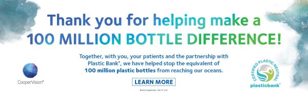 1. CVI data on file, 2022. Net Plastic Neutrality, in the contact lens industry, out of the top 4 global contact lens manufacturers. Net plastic neutrality is established by purchasing credits from Plastic Bank. A credit represents the collection and conversion of one kilogram of plastic that may reach or be destined for waterways; collection locations are determined by Plastic Bank. CooperVision purchases credits equal to the weight of plastic in clariti® 1 day and MyDay® US orders in a specified time period. clariti® 1 day and MyDay® plastic is determined by the weight of plastic in the blister, the lens, and the secondary package, including laminates, adhesives, and auxiliary inputs (e.g. ink). 2 clariti® 1 day / MyDay® daily disposable orders includes [clariti® 1 day sphere, clariti® 1 day toric, and clariti® 1 day multifocal/ MyDay® daily disposable, MyDay® daily disposable toric, MyDay® daily disposable multifocal] product sold and distributed by CooperVision in the US. Net plastic neutrality is established by purchasing credits from Plastic Bank. A credit represents the collection and conversion of one kilogram of plastic that may reach or be destined for waterways. CooperVision purchases credits equal to the weight of plastic in clariti® 1 day / MyDay® daily disposable orders in a specified time period. clariti® 1 day / MyDay® daily disposable plastic is determined by the weight of plastic in the blister, the lens, and the secondary package, including laminates, adhesives, and auxiliary inputs (e.g. ink). CVI Data on file, 2022.