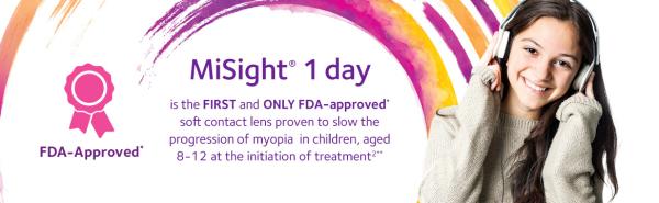 *Indications for Use: MiSight 1 Day (omafilcon A) Soft (Hydrophilic) Contact Lenses for Daily Wear are indicated for the correction of myopic ametropia and for slowing the progression of myopia in children with non-diseased eyes, who at the initiation of treatment are 8-12 years of age and have a refraction of -0.75 to -4.00 diopters (spherical equivalent) with ≤ 0.75 diopters of astigmatism. The lens is to be discarded after each removal.