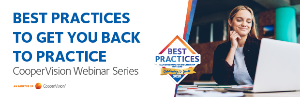 CooperVision’s Best Practices honorees Present “Best Practices to Get You Back to Practice,” an informational webinar series. The honorees – spanning from over the program’s five years – will provide insight into their personal experiences with their practices during the pandemic and share their advice for reopening.