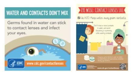 An increase of Acanthamoeba keratitis cases in some parts of the world, particularly the UK, has highlighted the risks of water and contact lenses.[13] While this risk has been known for some time a recent review article found that, despite the documented risks due to water exposure, water-related habits are common among CL wearers.14 The article found that discrepancies exist in guidelines for CL hygiene and compliance globally.14 The article concludes that guidelines should unequivocally advocate for the avoidance of any water exposure including handling CLs with wet hands, rinsing CLs or storage cases in tap water, showering while wearing CLs and swimming with CLs without wearing goggles.[14] This echoes the recommendations made by the CDC13, FDA[15], AAO[16] and AOA[17], respectively. Contact lens manufacturers, like CooperVision, have also been proactive in sharing the risks of water exposure and contact lenses.[18] The CDC's resources can be useful tools to communicate the risk of water exposure and contact lenses, and other risky behaviors, in a variety of media including posters for your practice and social media campaigns.