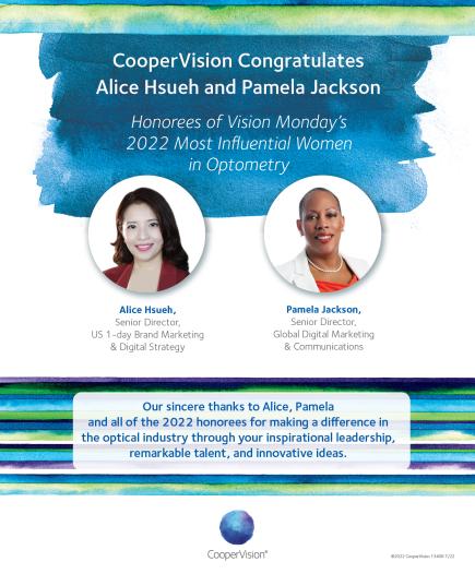 Alice Hsueh (Senior Director of US 1-day Brand Marketing and Digital Strategy) and Pamela Jackson (Senior Director of Global Marketing & Communications) at CooperVision were named amongst 2022's Most Influential Women in Optical by Vision Monday magazine.