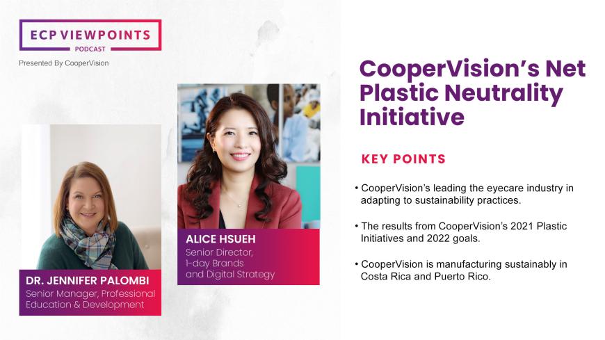 In this episode of the ECP Viewpoints Podcast, Dr. Jennifer Palombi talks with Alice Hsueh, CooperVision's Senior Director of 1-day brands and digital strategy, about the impact of CooperVision's net plastic neutrality program and the addition of the MyDay® family to the initiative earlier this year. Click below to listen!