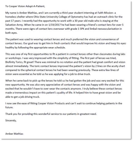 Optometry students are encouraged to “adopt” a deserving patient from their community into the program, fit them with CooperVision soft contact lenses, and provide appropriate follow-up care during their clinical contact lens rotation. Every optometry student is allocated one complimentary annual supply of soft contact lenses from CooperVision that they can provide to a deserving low income patient in their community. Each school sets their own eligibility criterion for patients.