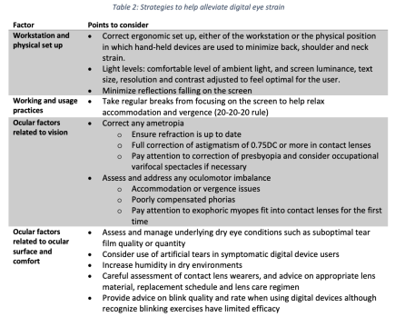 Ocular factors to address in cases of digital device use symptoms include ensuring the refraction is up to date, that any presbyopia is appropriately corrected, and in soft contact lenses, any astigmatism of 0.75DC or more is corrected46,47. ‘Occupational’ varifocals or prescriptions specific to device viewing distances may be helpful. The use of spectral filters, such as blue light filters, is growing in popularity, however a recent systematic review suggested more research is required to confirm their efficacy48. Oculomotor balance should be assessed, addressing any accommodative or vergence issues present. Take care to assess convergence and how well compensated any exophoria is in myopes newly fit with contact lenses; they lose the effect of base in help in their spectacles when wearing their contact lenses.