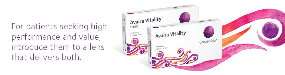 Avaira Vitality® contact lenses are just what value-conscious‡ contact lens wearers have been looking for. Avaira Vitality® lenses are conveniently offered in 6-packs, allowing your patients—and your practice—purchase flexibility.