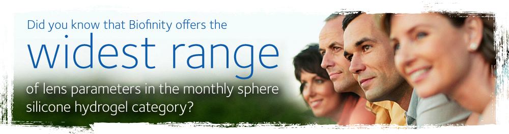 - Biofinity® and Biofinity® XR together offer sphere powers from +15.00D to -20.00D; 1.5x greater than some other monthly replacement spherical silicone hydrogel lenses.2