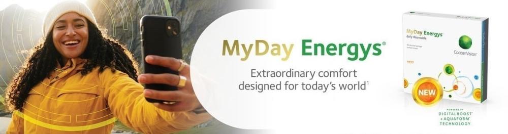 Phones, tablets and laptops; morning, noon and night. We’re all on, all the time. Finally, there’s a lens with the technology and comfort to take them all on. MyDay Energys® is the FIRST AND ONLY 1-day contact lens combining INNOVATIVE ASPHERIC DESIGN and MATERIAL TECHNOLOGY to help tiredness and dryness associated with digital device use.